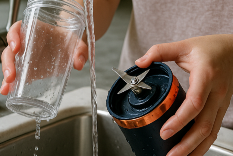 Cleaning is simple. Just add water and a drop of dish soap to the cup, secure the lid, and blend for a few seconds. Rinse thoroughly with clean water. Avoid submerging the base in water - wipe it clean with a damp cloth.